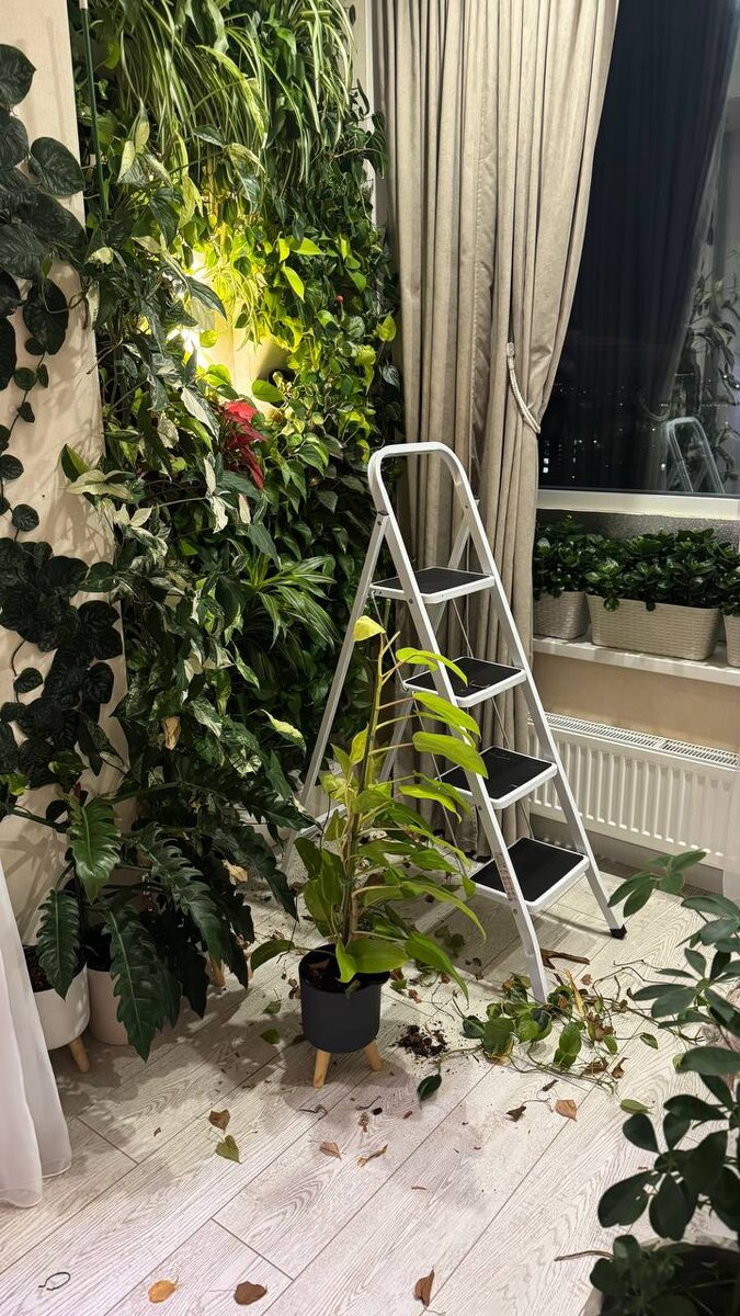 Хотела показать это завтра, когда все доделаю, но нет моих сил терпеть, хочу поделиться прямо сейчас 😱 Давно хотела привести фитостену в порядок, убрать желтые листья, которые появились после переукоренения. Основную часть очистила вчера, сегодня оставалось только верхние два уровня. Думала доделаю быстренько и всё, а потом взялась за ножницы… дальше все как в тумане 😅 Полностью срезала подсохший филодендрон, а на его место разместила сингониум империал вайт (давно думала, куда бы его приспособить, двухметровая опора подходила к концу). И в итоге Я ЕГО ПЕРЕСАДИЛА! 🥳 Страшно было сломать, но всё обошлось. Это ещё не конец, завтра надо подсадить справа от сингониума эпипремнум, чтоб закрыть лысину у основания и ещё надо подтянуть канат, а-то из спальни это всё пока не очень смотрится. Но это завтра, на сегодня - собрать с пола грунт и любоваться результатом 🥰 Yu_jungle 🌱
