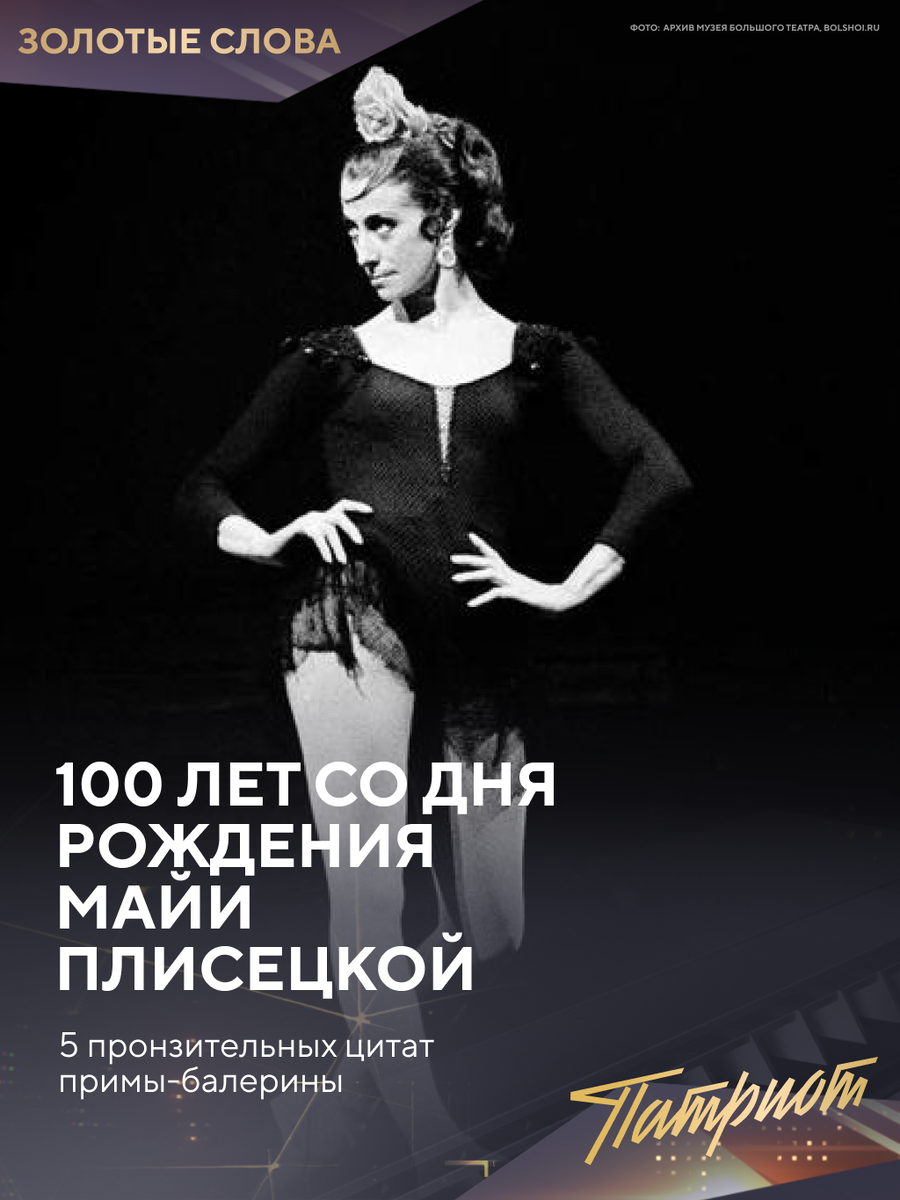 20 ноября 1925-го родилась Майя Плисецкая — символ русского балета, чей талант и харизма навсегда вошли в мировую историю театрального искусства! Её имя — символ высшего мастерства, бесконечной энергии и силы духа. ❗️Особое место в жизни артистки занимала любовь. Она была единственной музой своего мужа Родиона Щедрина. Их творческий и личный союз стал примером вдохновения и верности для многих. В карточках — золотые слова примы-балерины Большого театра. Подписывайтесь на канал "Патриот"
