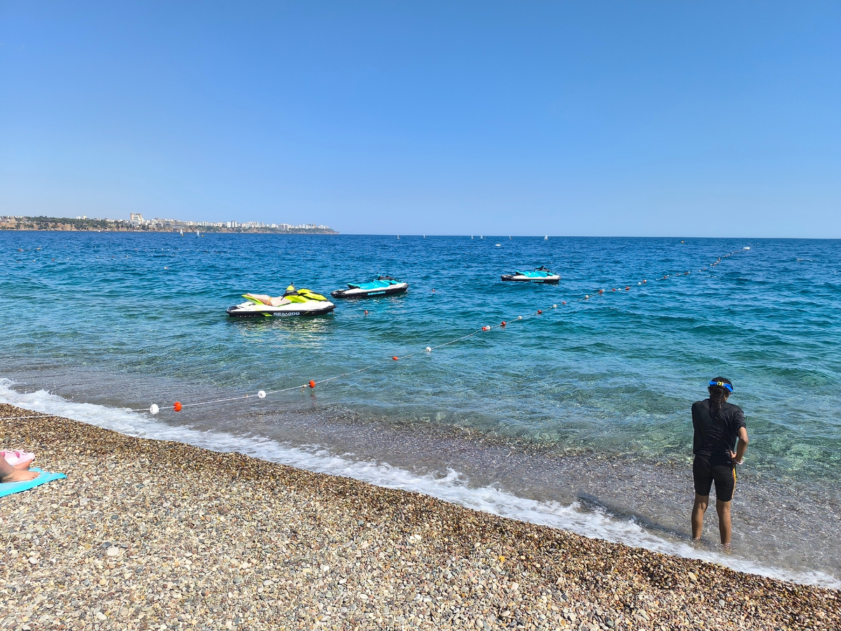 Давайте теперь поговорим о плюсах. Начнем наверное с моря. Средиземное море в Анталье чистейшее и активный купальный сезон начинается где-то с мая месяца и продолжается до октября. Это, можно сказать, когда пляжи полны отдыхающих и температура воды в море не опускается ниже + 22 +23. Хотя для местных +22 это очень холодно. Комфортная температура воды считается для них +27 и выше. Для приезжающих с холодного климата, я думаю, купание возможно даже в декабре , или в январе, когда температура воды составляет +17 градусов. Также следует отметить, что все пляжи Антальи получают голубой флаг подтверждающий чистоту морской воды и пляжной территории. В Анталье всего находится четыре пляжа : Лара протяженностью 5 км , Коньяалты протяженностью 8 км, Сарысу длиной около 2 км и Мермерли - миниатюрный пляж в старом городе Калеичи. Кроме Мермерли все пляжи бесплатные и имеют необходимую инфраструктуру, т.е. туалеты, раздевалки, пункты проката, кафе и т.д. Мермерли и Лара песчаные пляж