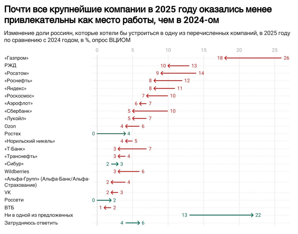 Разочарование россиян в крупных работодателях растет: ВЦИОМ По данным ВЦИОМ, 22% трудоспособных россиян не хотят работать ни в одной из 20 крупнейших компаний, что значительно больше, чем в предыдущие годы (13% в 2024 и 12% в 2021). Фактически, все финансовые компании в списке показали как минимум двукратное снижение привлекательности. ────────── ⚡️Важные новости – без лишнего шума!⚡️ Подпишись на канал и получай только суть: оперативно, чётко, по делу! 👉 ИнфоСплетник | @infospletnik