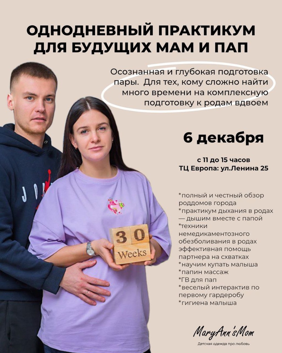 ОДНОДНЕВНЫЙ ПРАКТИКУМ ДЛЯ ПАР ПО ПОДГОТОВКЕ К РОДАМ Приглашаем вас с партнером на большое практическое занятие, где за 1 день вы подготовитесь к появлению малыша и познакомитесь с самыми значимыми специалистами материнства и детства из Екатеринбурга🙌 📆6 декабря (суббота) с 11 до 15 часов 📍ТЦ Европа: ул.Ленина 25 Программа мероприятия: https://maryannsmom.ru/rody_shcool_ekb Получить скидку -50% можно по ссылке https://docs.google.com/forms/d/13VcicUUdkiNtz1dyQPgbl5gsKaigf-MgfKVAJy1K78c/edit?usp=drivesdk