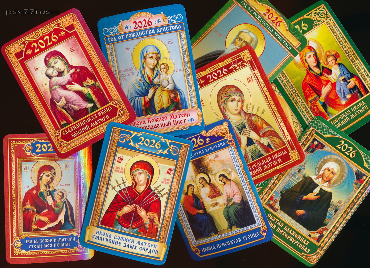 Карманные календарики - Иконы на - 2026 год. Издатель - ООО " Белая Ворона". г.Москва.Произведено в России. Количество - 10 штук.