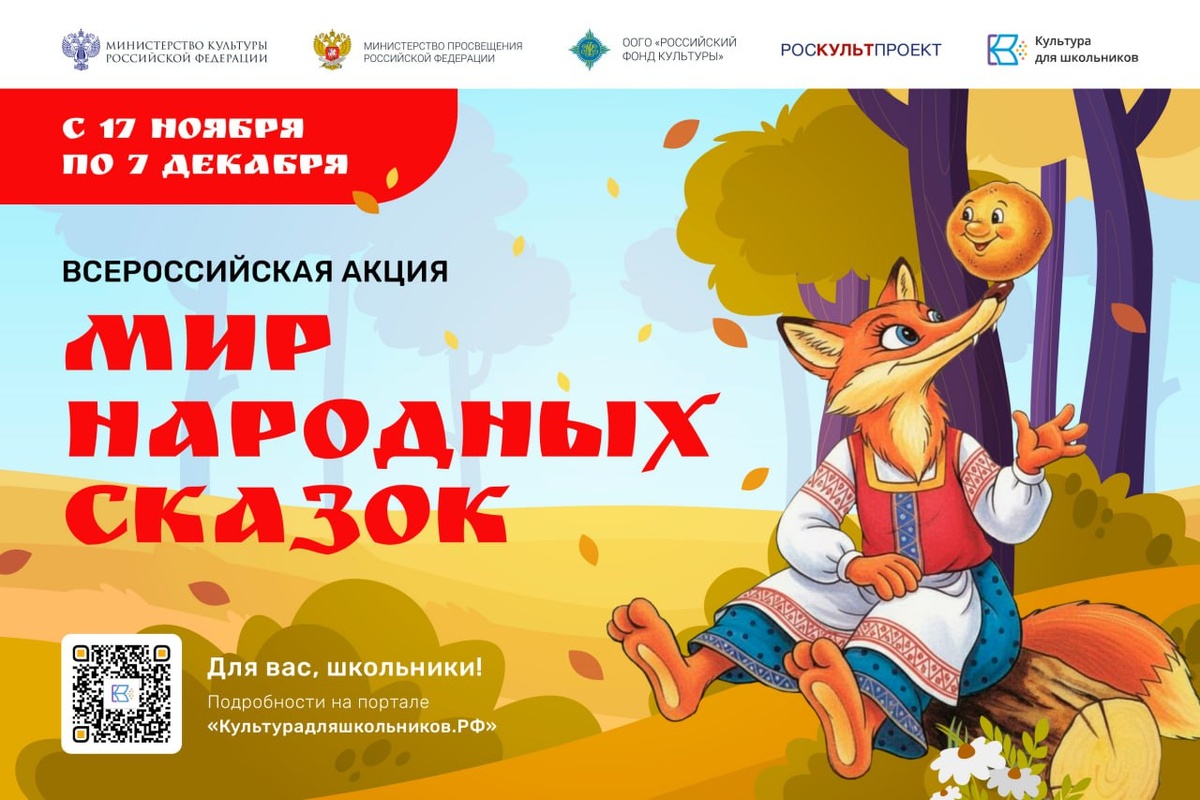 В России стартует масштабная акция «Мир народных сказок» 17 ноября 2025 года стартует всероссийская акция «Мир народных сказок», организованная в рамках проекта «Культура для школьников». Мероприятие посвящено удивительному жанру эпоса – древнейшему виду повествования, в основе которого лежат картины народной жизни, рассказывающие о героизме, мудрости и жизненном опыте наших предков. Для участия в акции ребятам необходимо подготовить работу в одной или нескольких из предложенных номинаций и оставить свою заявку на участие в личном кабинете на портале «Культурадляшкольников.РФ». Читать подробнее Прием заявок завершится 7 декабря 2025 года. По итогам экспертная комиссия выберет 100 наиболее интересных работ-победителей, которые будут опубликованы 18 декабря 2025 года на портале «Культурадляшкольников.РФ». Проект реализуется Минкультуры России, Минпросвещения России, Центром культурных стратегий и проектного управления (РОСКУЛЬТПРОЕКТ) и Российским фондом культуры.
