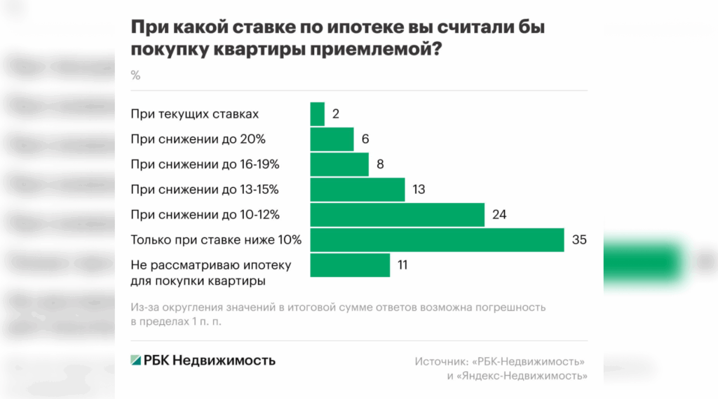 Такие выводы представлены в совместном исследовании «РБК Недвижимости» и «Яндекс Недвижимости». Согласно данным, 35% опрошенных готовы рассматривать ипотеку при ставках не выше 10%, а около 24% считают допустимой ипотеку с процентами в диапазоне от 12% до 14%. Для сравнения, по состоянию на середину ноября средняя ставка по ипотеке на вторичное жилье составляет 21,22%, а на покупку новостроек — 21,24%. В текущих условиях только 2,3% респондентов заявили о готовности взять ипотеку. При снижении ставки до 20% годовых доля желающих оформить кредит может увеличиться до 5,5%, а при ставках в пределах 16–19% годовых — до 8,4%.