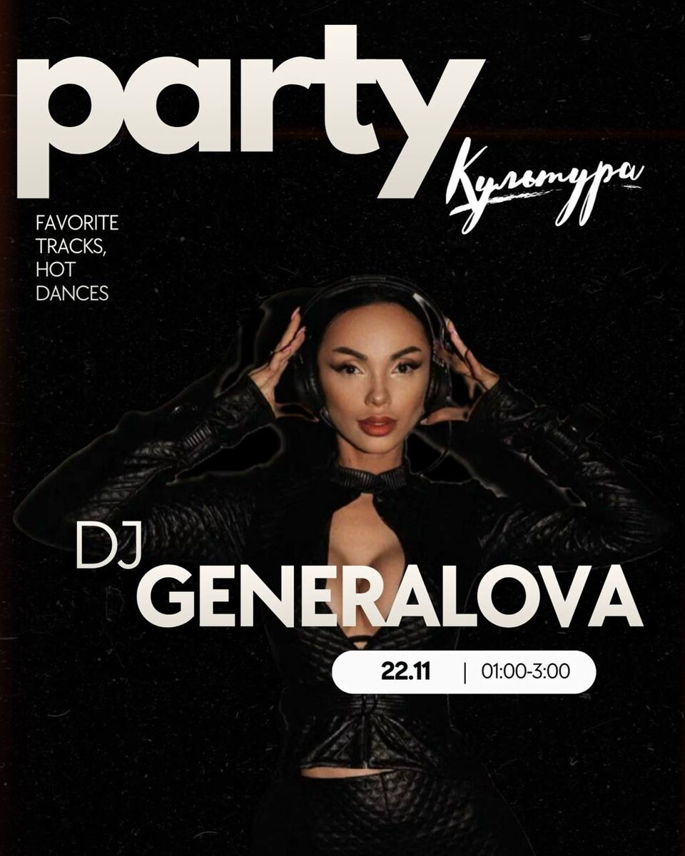 На предстоящие выходные мы подготовили для вас что-то особенное — в субботу, 22 ноября, с 01:00 до 3:00 за пультом @dj_generalova 🔥 Будет сочно, ярко и очень жарко — то, что нужно всем нам в эти первые холодные дни 21 ноября [ с 21:00 ] : Ресторан: Tyapchev Клуб: Salavat | Minaev | Desh 22 ноября [ с 21:00 ] : Ресторан: Cover Band «Replay» 🩶 Клуб: Zaycev | Generalova | Desh Открываем бар в 18:00! До встречи в Культуре 🍹