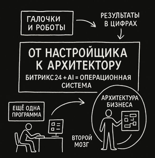 После таких разговоров мне почти всегда прилетает одно и то же сообщение в личку. Окей, я примерно понял, куда всё движется, но что лично мне делать уже завтра утром ...? Я очень хорошо помню момент, когда сам задал себе тот же вопрос. Тогда я честно увидел, что если останусь в роли человек, который настраивает Битрикс24 руками, то через пару лет мне самому будет неинтересно и финансово тесно. И я начал перестраиваться. Сначала я перестал продавать настройку ради настройки. Каждый раз, когда ко мне приходила просьба прикрутить ещё одного робота или настроить воронку как у знакомых, я возвращал разговор к результату. 1. Зачем это компании. 2. Как это связано с деньгами. 3. Что изменится для клиентов и для команды. Часто оказывалось, что настоящая задача вообще не в автоматизации, а в продукте, маркетинге или структуре отдела продаж. Потом я начал смотреть на проекты не как на набор работ по часам, а как на создание системы управления. Меня стал интересовать маршрут клиента от