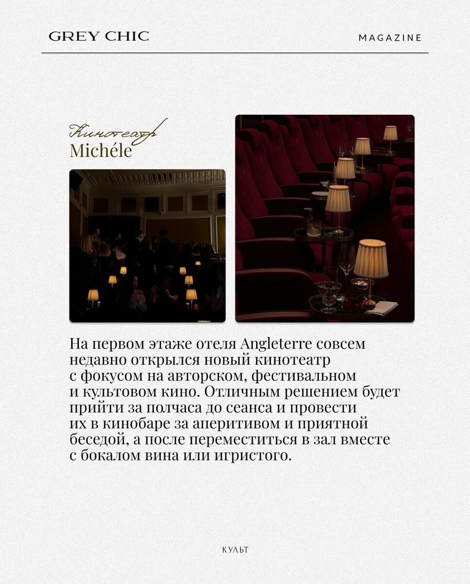В Петербурге улицы никогда не пустеют от туристов, а билеты в главные музейные и исторические институции порой просто не достать (давайте вспомним аншлаги на выставках в «Русском музее»). Тогда как петербуржцы удовлетворяют свою тягу к прекрасному и какие места выбирают для своего досуга? Кроме особых хитростей, местные жители знают и особые места. Списком таких локаций с нами поделилось медиа об искусстве и культурной жизни «Культ». Смотрим подборку и пополняем список своими рекомендациями. GREY CHIC