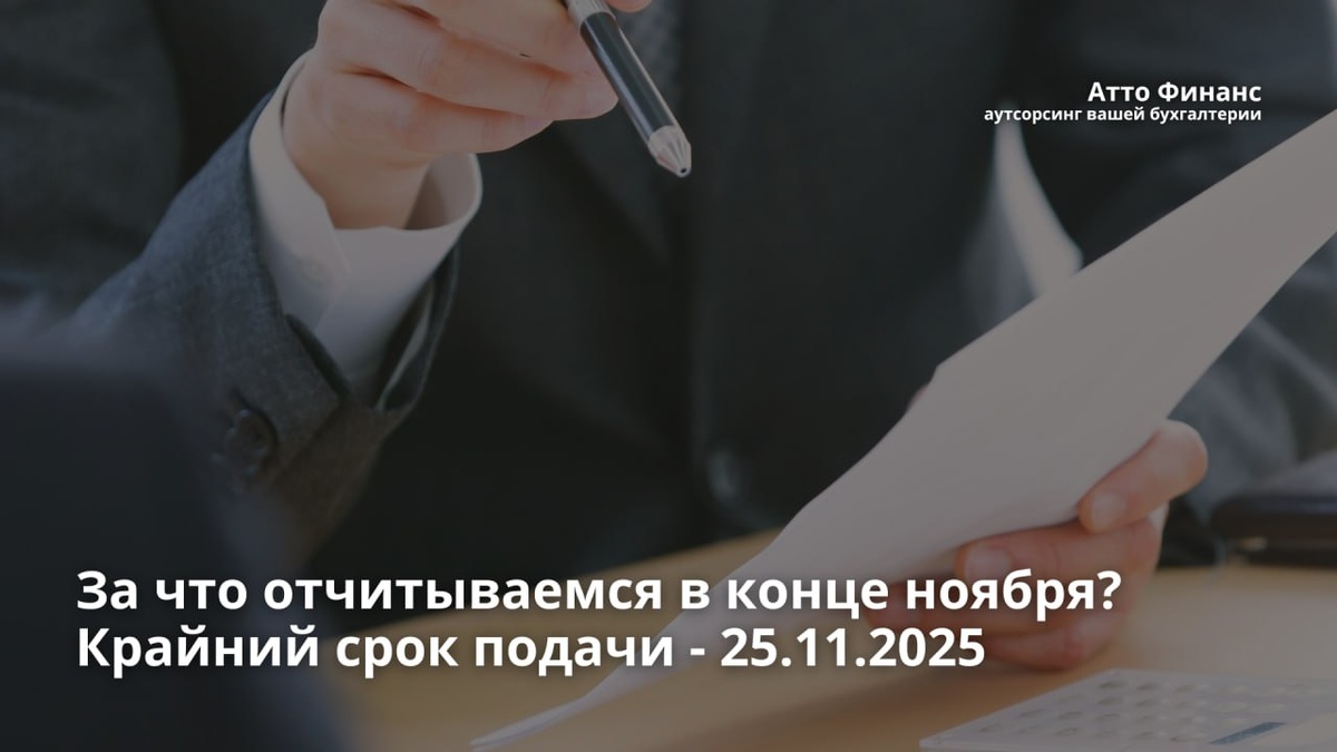 🔔Напоминаем о приближении срока подачи налоговой отчетности. ❗️Крайняя дата: 25 ноября 2025 года. За что отчитываемся? 1. Уведомление об исчисленных суммах налогов/авансов/взносов, включая НДФЛ с выплат работникам за период с 1 по 22 ноября 2025 года. 2. Декларацию/Расчет по налогу на прибыль за январь-октябрь 2025 года (для тех, кто уплачивает ежемесячные авансы по фактической прибыли). 3. Форма ЕФС-1: предоставление подраздела 1.1 и 1.3 Раздела 1 за отчетный месяц "октябрь 2025 года" (*форма обязательна для всех ООО и ИП, при наличии наёмных работников). 4. Персонифицированные сведения о физических лицах: за отчетный период "октябрь 2025 года". Если у Вас возникают сложности с подготовкой и своевременной сдачей отчетности, или вы хотите оптимизировать этот процесс, наша компания «Атто Финанс» готова взять на себя полную подготовку и представление вашей налоговой отчетности в ИФНС и СФР, объединивший пенсионный и социальный фонды. Стоимость данной услуги от 1 500 рублей за одн