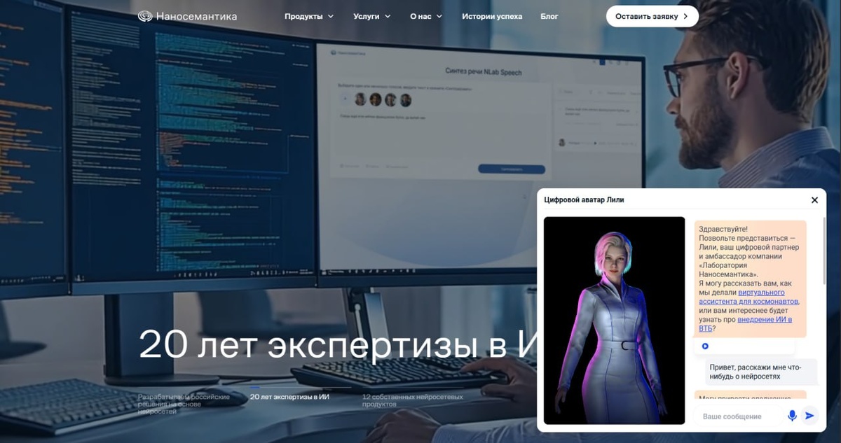 ⭐️ Цифровой аватар Лили стал полноценным виртуальным консультантом нашего сайта 🚀 Мы интегрировали нашего цифрового амбассадора Лили в интерфейс сайта. Теперь это не просто персонаж для выставок и офиса, а доступный каждому интерактивный консультант, живущий в виджете в нижнем правом углу любой страницы сайта. 💡 Как это работает? ▪️ DialogOS управляет сценариями и логикой беседы. ▪️ NLab Speech ASR & TTS обеспечивают качественное распознавание вашего голоса и синтез речи Лили. ▪️ YandexGPT, подключенный через платформу DialogOS, добавляет аватару гибкости и позволяет формулировать естественные, нешаблонные ответы. 🎯 О чем с ней поговорить? Лили — эксперт по вселенной «Наносемантики». Она свободно ориентируется во всех наших продуктах, услугах и историях успеха наших клиентов. Спросите её о чем угодно — голосом или текстом. ⌨️ Пообщаться с Лили можно здесь.