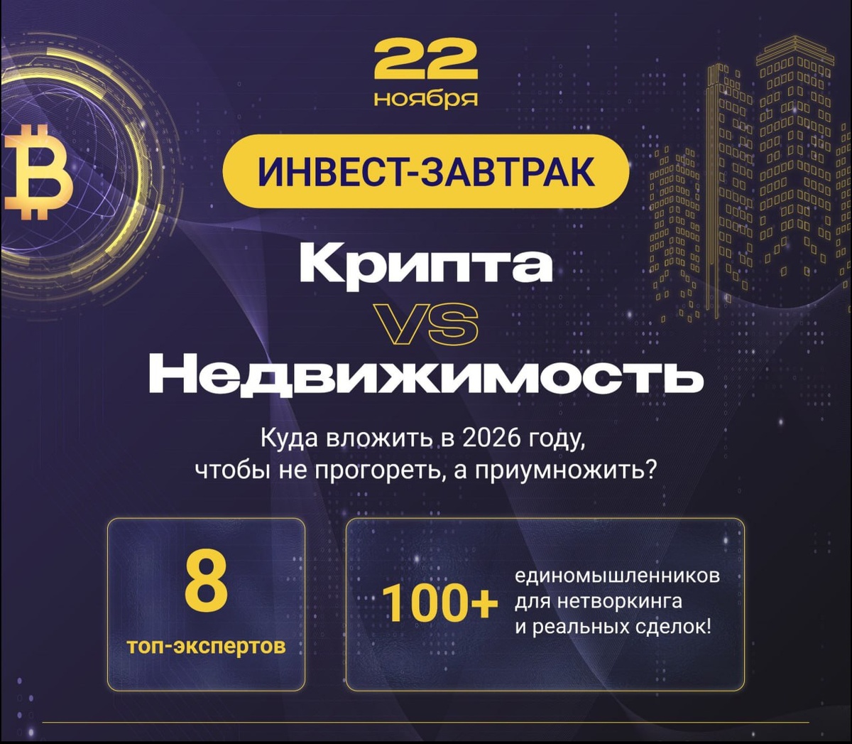 Я ВЫСТУПАЮ НА SIDE EVENT Хотите узнать, что выгоднее: крипта или недвижимость? 🤔 Приглашаем вас на жаркий баттл! 🔥 Очередной Инвест-завтрак по руководством MARSEL INVEST и COINCRAFT ❤️ 22 ноября c 12:00 до 16:00 эксперты сойдутся в дискуссии, чтобы выяснить, куда сейчас перспективнее вкладывать деньги. ❤️ Что вас ждет: Аргументы "за" и "против" от гуру инвестиций. Разбор реальных кейсов. Ответы на ваши вопросы в режиме нон-стоп. Интересный факт: В 2021 году доходность некоторых криптовалют превысила доходность недвижимости в несколько раз! 🤯 Но стоит ли рисковать? Что разберём: 🔸 До 60% годовых на земле в Алтае 🔸 Отели с 25% доходностью 🔸 Выкуп квартир в Москве 🔸 Крипто: тренды и драйверы роста 2026 🔸 Топ-10 альткоинов с 10x-потенциалом 🔸 3 стратегии роста крипто-депозита ❤️ Фуршет + нетворкинг + реальные сделки. Буду рад встретиться с вами лично и поговорить ❤️ 🔴Регистрация и детали - https://investpeople.club/crypto_vs_realestate?utm_source=tikhonov