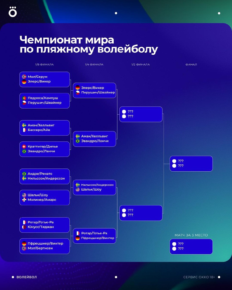 Четвертьфиналы ЧМ по пляжному волейболу среди мужчин готовы. Разглядываем 👀 🇸🇪🇩🇪 Заметно выделяются шведские и немецкие пары. Кто же пройдет в полуфинал? 🏖 Узнаем завтра в Okko: https://okko.tv/s/v7o