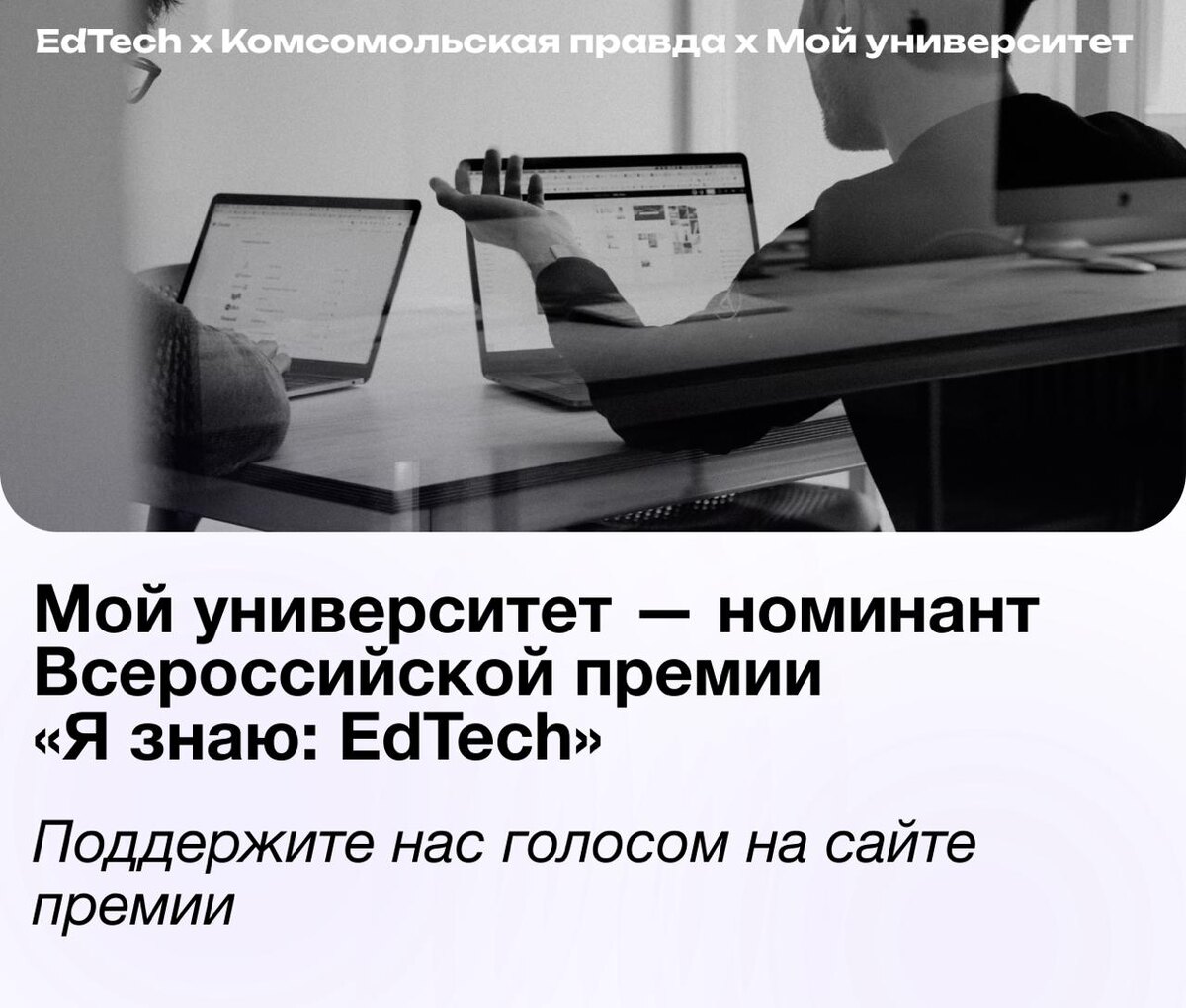 🏆 Мы участвуем в премии! Радостно делимся новостью — «Мой университет» стал участником премии «Я знаю: EdTech» от Комсомольской правды в номинации «Лучшее EdTech-решение в сфере ДПО». Премия создана, чтобы отметить самые эффективные и инновационные практики в онлайн- и дополнительном образовании по всей стране. Победитель выбирается народным голосованием, и поэтому нам очень нужна ваша поддержка. 💚Как помочь? Это несложно! На сайте премии можно проголосовать за нас. Если вы обучались в нашем центре, участвовали в мероприятиях и проектах, или просто разделяете нашу миссию — пожалуйста, присоединяйтесь! 🩷Как проголосовать: 1. Перейти на сайт премии «Я знаю: EdTech»: https://edtech.kp.ru/nomination-dpo 2. Авторизироваться через соцсети или почту. 3. В разделе номинации «Лучшее EdTech-решение в сфере ДПО» найти «Мой университет» и проголосовать. Каждый голос — это знак, что мы движемся в правильном направлении, что наши методы, форматы и смыслы находят отклик. Спасибо каждому, к