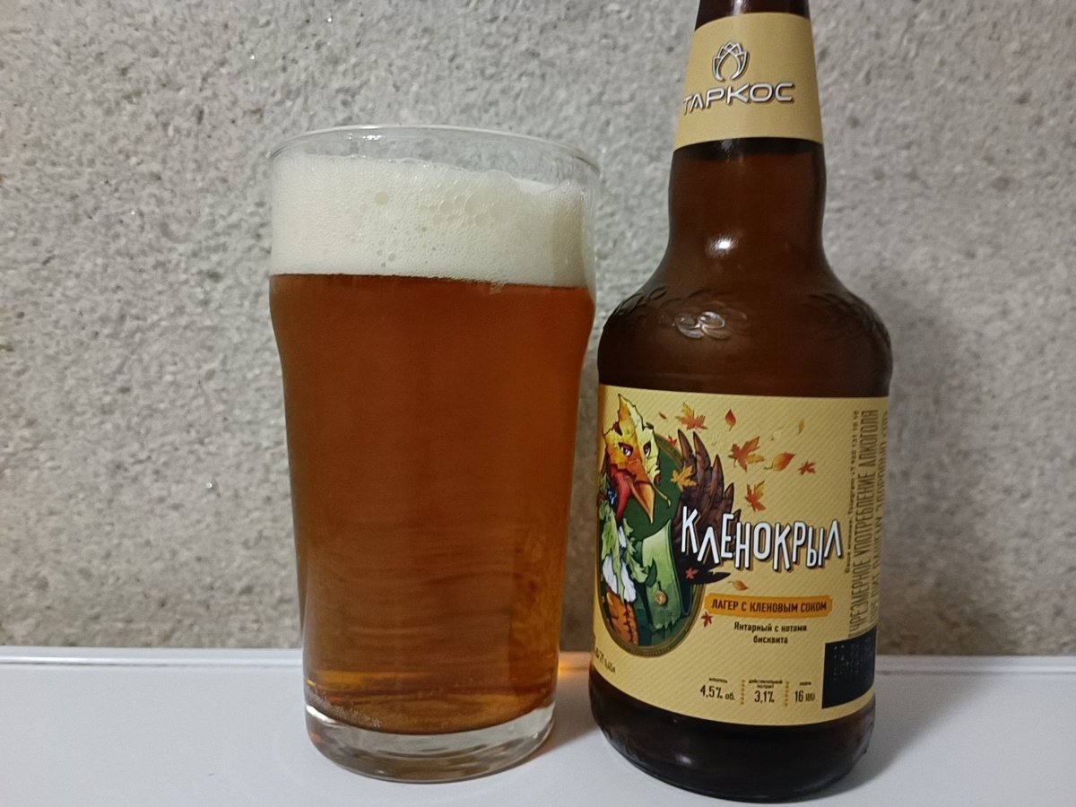 Сегодня у меня в бокале новинка от Воронежской пивоварни Таркос под названием Кленокрыл. Это лагер с добавлением кленового сиропа. Задумка интересная, посмотрим на реализацию. Алк. 4.5 Бутылка объёмом 0.45 литра стоит около 90 р. Купил в магазине Пятёрочка. Пиво темно-золотистого, ближе к медному цвета с небольшой пенной шапкой. Аромат солодовый с ноткой бисквита. Во вкусе довольно плотная солодовая база с явным оттенком кленового сиропа, который даёт хоть и ощутимую, но не избыточную медовую сладость. Баланс хороший и в целом, это вкусно, хотя и понравится далеко не всем. Как эксперимент однозначно плюсик, но я больше за хмель в лагерах, потому пройду в следующий раз мимо. Но пиво достойно внимания на мой взгляд. 7/10 Моё мнение не претендует на истину в какой бы то ни было инстанции, это всего лишь частная точка зрения. Поддержите автора лайком и подпиской, если было интересно. Чрезмерное употребление алкоголя может нанести вред вашему здоровью.