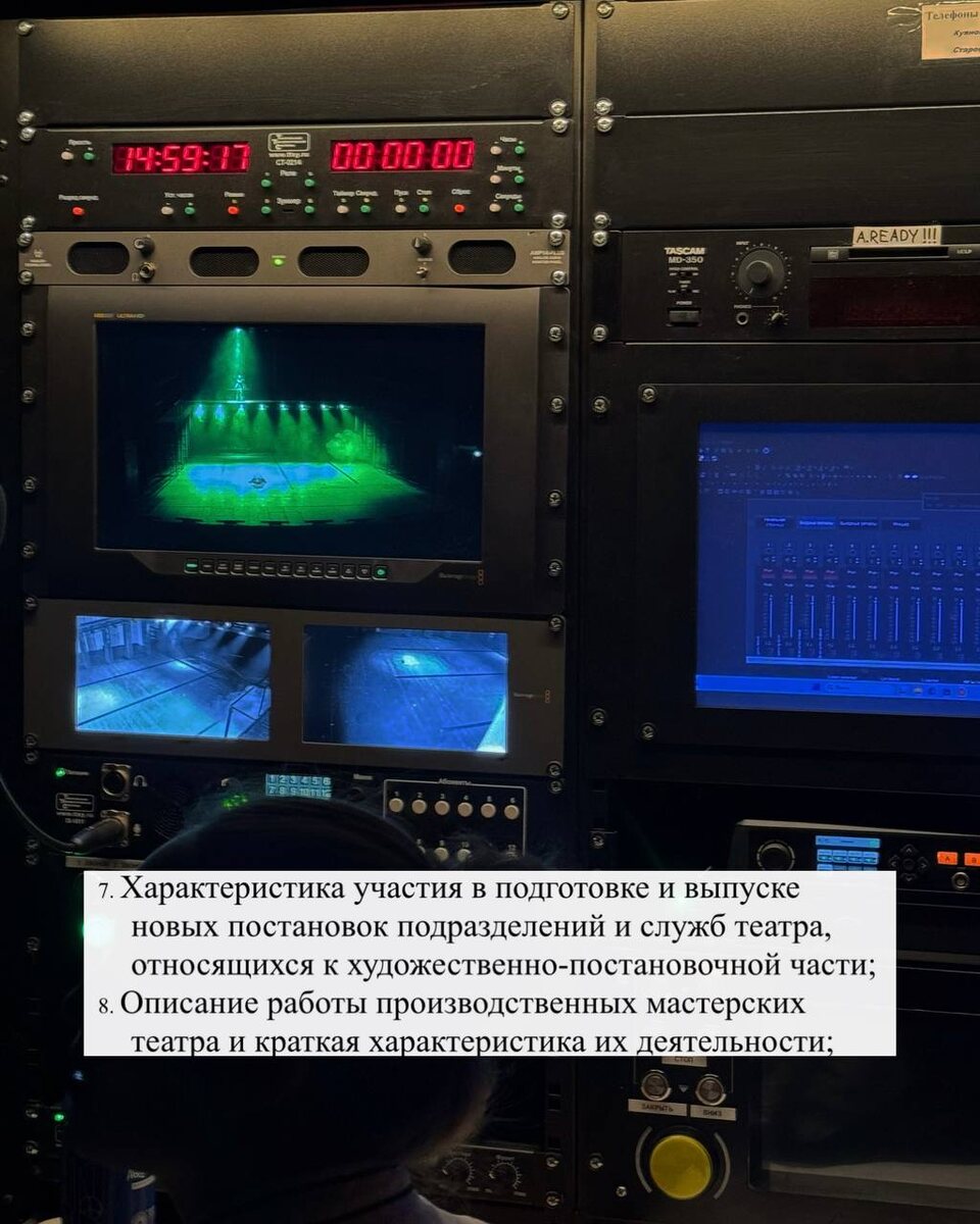 Сегодня провела два получасовых интервью — с директором по художественно-постановочной части и завпостом. Теперь мне предстоит расшифровать оба разговора и превратить их в два из десяти пунктов отчёта по практике ❤️🔥 Это было невероятно интересно: сценография и вообще вся визуальная часть спектаклей — моя слабость, то, к чему у меня больше всего лежит душа. Я расспрашивала о процессе создания сценографии, о том, как художники взаимодействуют с производственными мастерскими, инженерами, технологами. Пыталась понять путь декорации из головы художника на сцену — максимально досконально😎 А впереди новые интервью и новые впечатления!