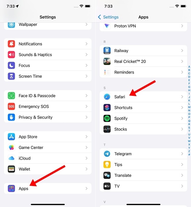 2. Прокрутите вниз и нажмите Safari . В iOS 18 прокрутите вниз и выберите «Приложения» > «Safari».