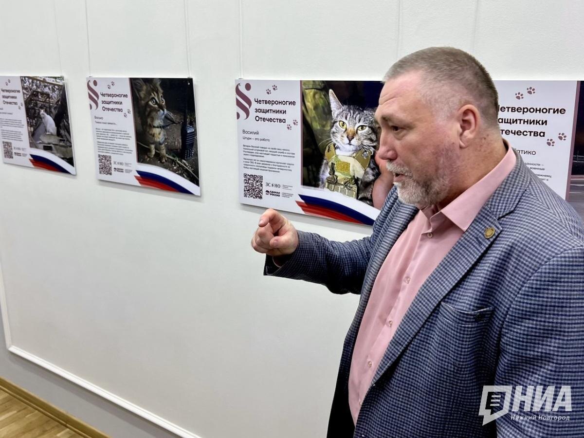 В Заксобрании Нижегородской области открылась трогательная и, как ни крути, человечная выставка под названием "Четвероногие защитники Отечества" (6+). Кто они, эти защитники без погон и приказов? Коты да собаки. Они пришли по зову сердца – согревать, защищать и спасать. Для России это первый подобный проект, потому он особенно ценен. Подробности – в материале НИА "Нижний Новгород". Инициатор выставки – Олег Андерсон, волонтер, ветеран боевых действий и сотрудник аппарата Заксобрания. Его фотографии – это не просто снимки животных. Это живые истории из зоны СВО: про котов-"сынов полка", собак-связистов, пушистых разведчиков и даже "дронобоев" с хвостами. Олег Андерсон начал возить гуманитарную помощь на Донбасс еще до начала СВО. Сегодня он делает это с такой частотой, с какой другие ездят летом на дачу. Из каждой поездки волонтер возвращается не только с благодарностями от военнослужащих, но и с десятками фотографий пушистиков. В какой-то момент снимков стало так много, что стало ясно: