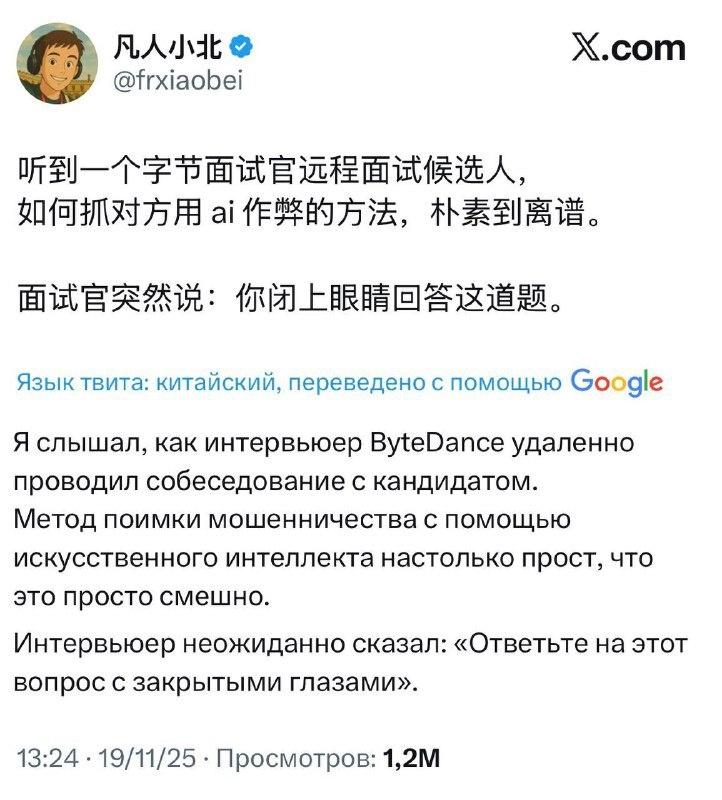 Китайские HR-ы неожиданно нашли оригинальный способ проверки соискателей с нейрокомпьютерами — они просят кандидатов отвечать на вопросы с закрытыми глазами. Это позволяет им убедиться, что кандидаты не подглядывают за ответами, используя ИИ. Постмейкер - автоматическое ведение канала 🤖 Анимация | СhatGPT-4 | Помощь с резюме