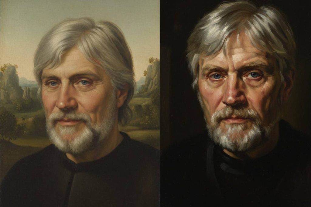 Два холста с портретами Юрия Рысухина стали частью юбилейной выставки «100 картин художников Оренбуржья» (6+) в Оренбургском музее изобразительных искусств. Изображения выполнены нейросетями в стилистике Рембранта и Леонардо да Винчи. Они точно отражают манеру мастеров прошлого, имеют характерные черты, цветовую палитру и выразительные методы. Этот год для Юрия Рысухина стал знаковым: в М’АРТе открылась галерея художника, музею ИЗО Рысухин передал порядка 400 своих работ, а авторский проект «100 картин художников Оренбуржья» (6+) отмечает свое 30-летие. Выставка откроется 21 ноября в 17:00 на Володарского, 13. На одной площадке зрители смогут увидеть работы 60 художников. Многие работы выставляются впервые. Все они созданы в Оренбуржье и отражают направления современного развития искусства. Познакомиться с выставкой можно до 21 декабря. Фото: Оренбургский музей ИЗО 6+