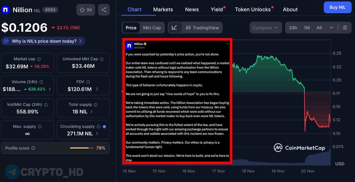 🙁 #NIL Скандал в Nillion…(twitter) ➥ Один из маркетмейкеров Nillion без разрешения проекта начал массово распродавать токены NIL + в течение инцидента отказался общаться с командой. ➥ NIL в моменте обвалился на -50%. ➥ В Nillion начали выкупать слитые токены за деньги из казны, чтобы стабилизировать рынок. ➥ Биржи заморозили кошельки, связанные с инцидентом, чтобы остановить дальнейшие продажи. ➥ Команда проекта собирается наказать виновных «по всей строгости закона». ➥ Какой именно маркетмейкер начал распродажу NIL – пока не разглашается. Cryptо Headlines