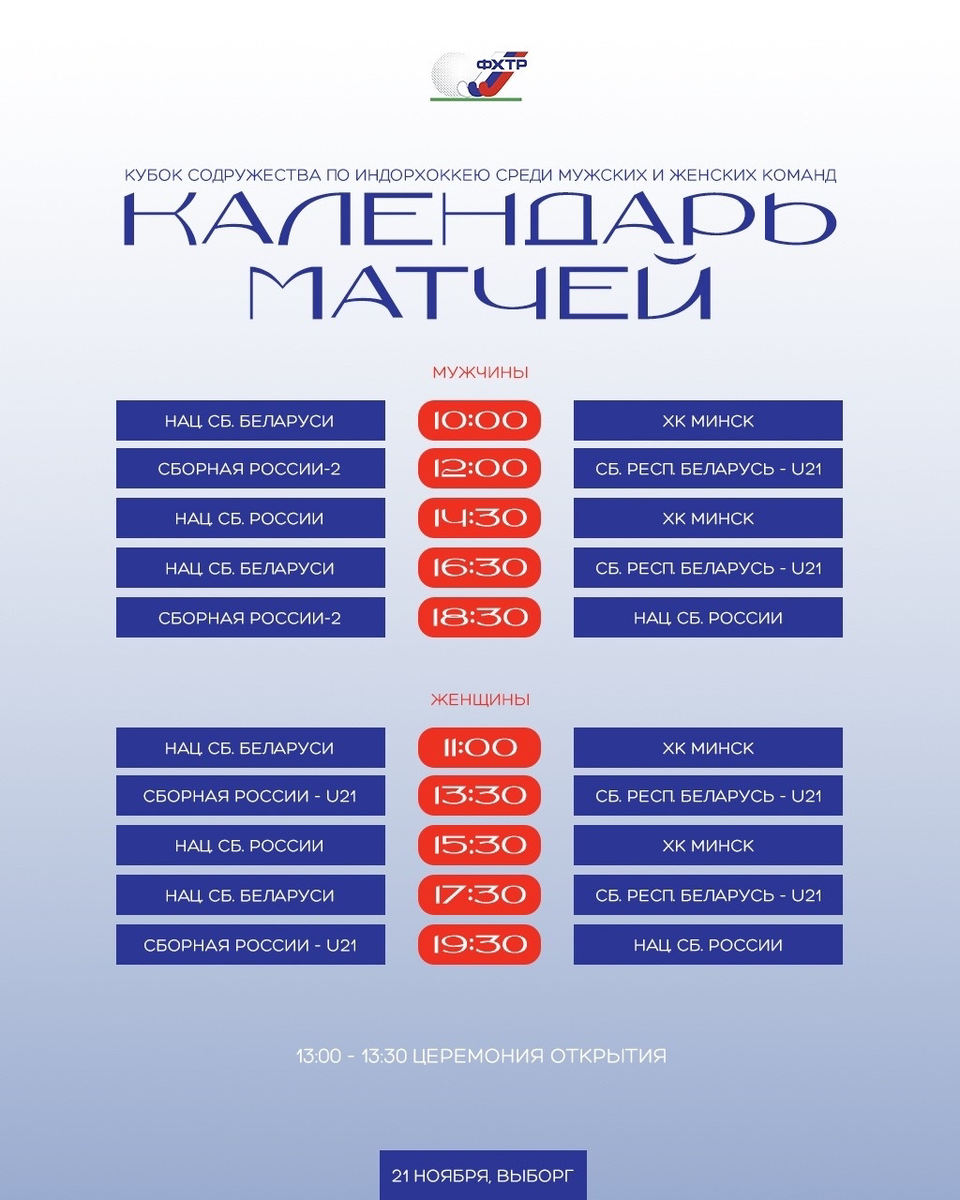 Завтра, 21 ноября, в Выборге стартует Кубок Содружества по индорхоккею. Расписание первого дня: