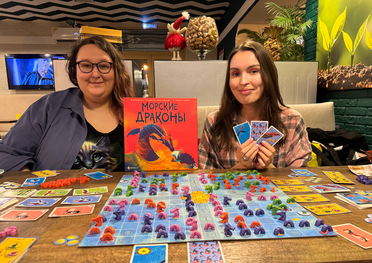 Вижу Лучани на коробке — сразу хочу опробовать игру. Тут, конечно, игру делал не только он — но щепотку интереса добавил художник (небезызвестный Веберсон Сантьягу), и поэтому «Морских драконов» я хотела опробовать давно. ПРАВИЛА Игра несложная, и правила вполне себе простые. В свой ход участник разыгрывает карту дракона и помещает по конфигурации, указанной на ней, своего дракона в одно из 4 царств игрового поля. Размещённый дракон должен примыкать либо к центру поля, либо к чужому дракону и ни при каких обстоятельствах не должен касаться ни одного своего дракона. Если вы при выставлении касаетесь чужого дракона, его обладатель получает 1 монету. Если вы выставляете дракона на клетки с водой (течения или водовороты), вы обязаны на каждую такую клетку заплатить 2 золотых монеты. После того как вы выставили дракона, вы смотрите, занял ли ваш дракон клетки с кораблями и/или кораллами. За каждый занятый коралл вы берёте карту бонуса (там могут быть разные бонусы — от монет до кораблей), а