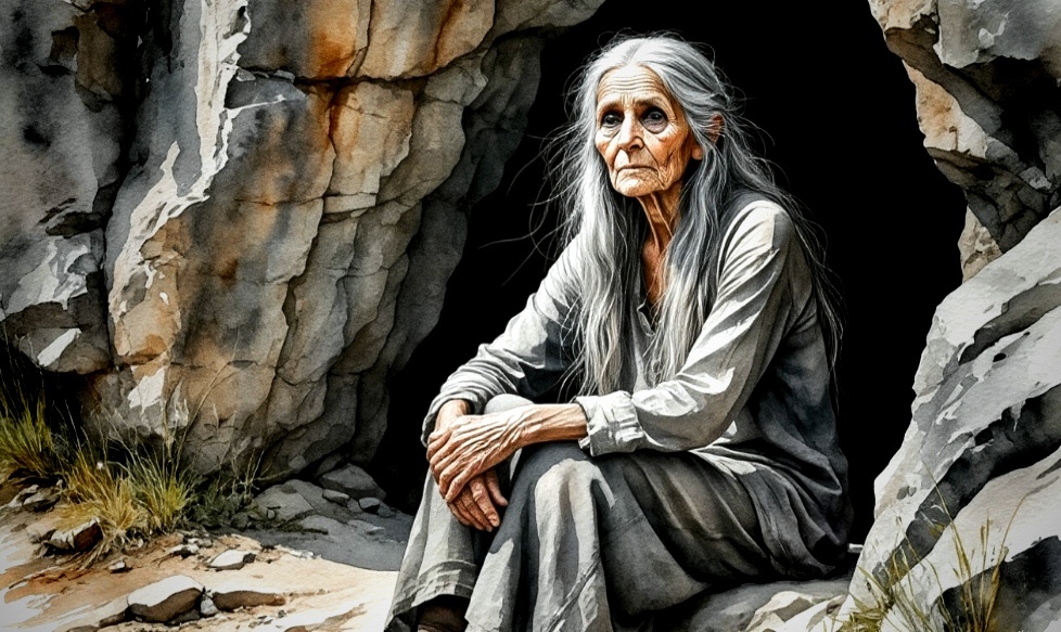 Старуха встала с лежанки и, спотыкаясь и вытянув вперёд руки, как слепая, побрела к выходу из пещеры с закрытыми глазами. Она продолжала звать свою маленькую помощницу, но та не откликалась, поэтому Рýми начала выкрикивать имя преемницы: