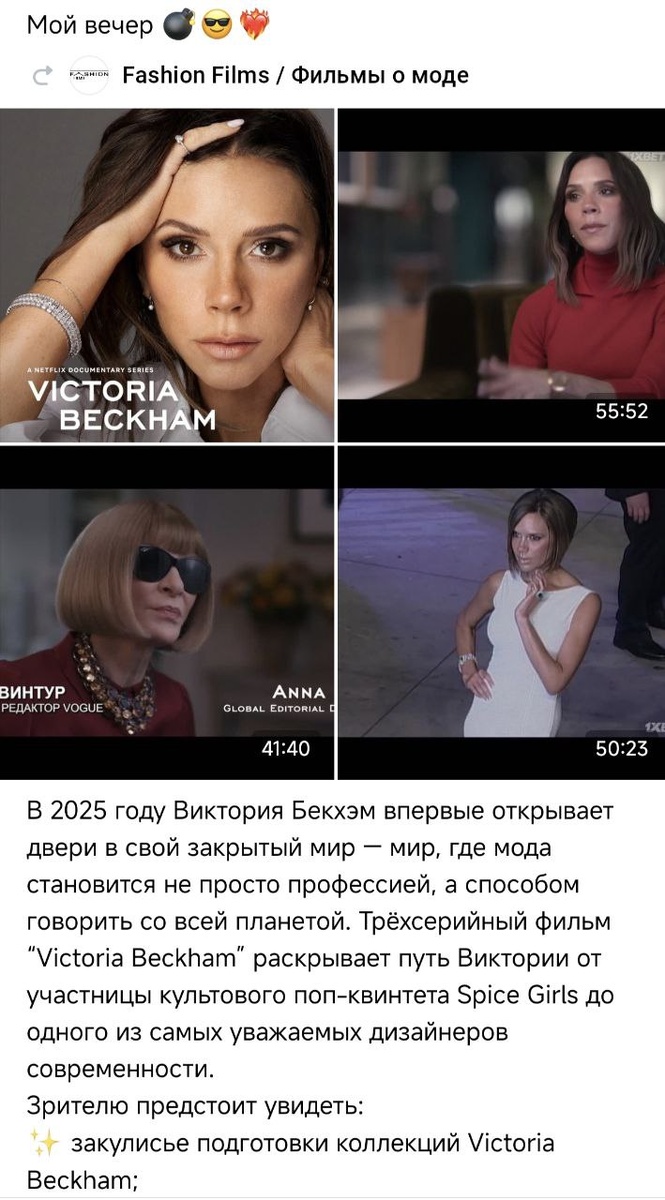 Мой вечер скрасил фильм. ❤️🔥💣❤️🔥 «Victoria Beckham» — это честный, элегантный и вдохновляющий портрет женщины, которая доказала, что стиль — это характер, а успех — результат постоянной работы над собой.