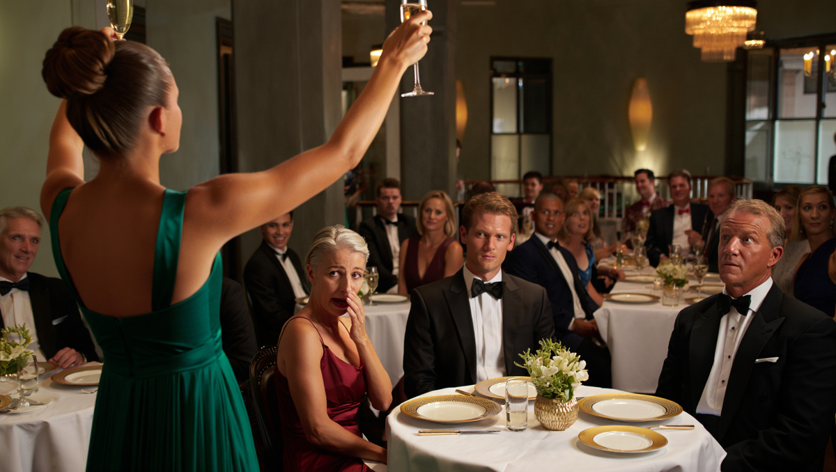 В зале повисла гробовая тишина. Люди перестали жевать. Они чувствовали, что тост пошел не по сценарию.