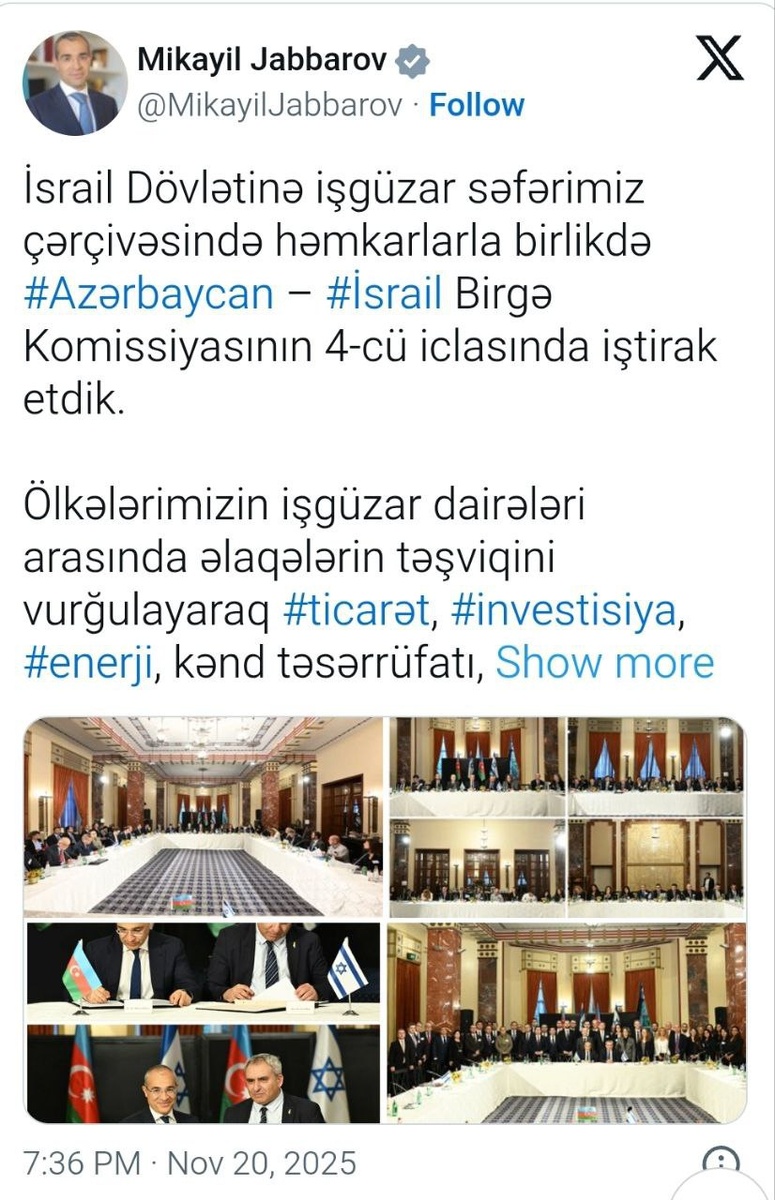🇦🇿🇮🇱 Министр экономики Микаил Джаббаров в рамках рабочего визита в Израиль принял участие в IV заседании Совместной азербайджано-израильской комиссии. Об этом глава ведомства сообщил на своей странице в социальной сети X. "Подчеркнув важность развития связей между деловыми кругами наших стран, мы обсудили перспективы расширения сотрудничества в сферах торговли, инвестиций, энергетики, сельского хозяйства, транспорта, цифровизации, туризма и других направлениях. Эти шаги отражают наши общие цели по диверсификации экономического взаимодействия и укреплению делового партнерства", - отметил М.Джаббаров. ✈️ Новости Азербайджана 🔗 Написать нам #ruoxuaz #МикаилДжаббаров #ОтношениямеждуАзербайджаномиИзраилем #МинистерствоэкономикиАзербайджана #Израиль