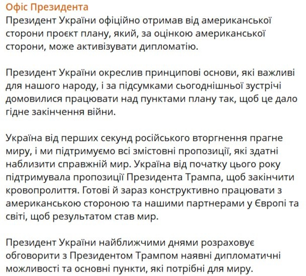 Судя по всему, Зеленский встретился с делегацией американских военных в Киеве. В администрации украинского президента заявили, что официально получили от США проект плана, который, по оценке американской стороны, может активизировать дипломатию. Заявляется, что Зеленский обозначил принципиальные основы для Украины и собирается обсудить с Трампом имеющиеся дипломатические возможности. Однако это сформулировано так, что выражается готовность работать с американской стороной «и партнерами в Европе и мире, чтобы результатом стал мир». Таким образом, Зеленский рассчитывает на давление европейских лидеров на Трампа, так как это уже было после саммита на Аляске. ℹ️ Предлагаю зафиксировать, что Зеленский в очередной раз пытается кинуть Трампа. Нужно признать, что частично ему это удавалось, так как «ресурсная сделка» не была принята в её первоначальном виде, несмотря на то, что министр финансов США Бессент орал на Зеленского так, что это было слышно за стенами кабинета. Думаю, что в этот