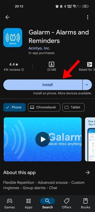 Включать будильник через наушники не рекомендуется, так как повышается риск нарушения режима сна и повреждения слуха, но если вы не хотите будить других, можете рассмотреть этот вариант. В телефонах Android отсутствует функция воспроизведения будильника через наушники для предотвращения проблем со здоровьем, но некоторые приложения могут добавить эту функцию. Для этой цели в Google Play Store доступно несколько сторонних приложений. Вот что вам нужно сделать. Galarm — это бесплатное приложение для Android из нашего списка, которое разбудит вас, не беспокоя окружающих. Приложение позволяет прослушивать сигнал будильника через гарнитуру, наушники или динамик. 1. Загрузите и установите приложение Galarm из Google Play Store. 2. Откройте приложение и предоставьте ему необходимые разрешения . 3. Нажмите кнопку «Продолжить» . 4. Вам будет предложено указать имя. Введите имя и нажмите «Сохранить» . 5. Теперь вы увидите основной интерфейс приложения Galarm. Переключитесь на значок шестерёнки