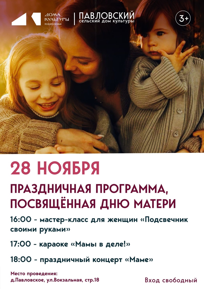 ✨ Приглашаем вас и ваших близких на тёплый и душевный праздник, посвящённый Дню матери! 🏡Вход: свободный (на мастер‑класс — по предварительной записи) Программа мероприятия: 🧑🎨16:00 — «Декор своими руками» Мастер‑класс для мам по декору подсвечника. Важно: участие по предварительной записи — оставляйте заявку в официальной группе Павловского Дома культуры. 🎙️17:00 — «Мамы в деле!» караоке‑вечер для мам. Спойте любимые песни и получите заряд позитива! 💐18:00 — «Маме…» Праздничный концерт, посвящённый Дню матери. Трогательные номера, тёплые слова и атмосфера любви и благодарности. 📆 28.11.2025 🏢 Павловский сельский дом культуры (СДК) 📍 г.о.Домодедово, дер.Павловское, ул.Вокзальная, д.18 💰 Вход свободный❗️ ✅ Мероприятия Домодедово https://dzen.ru/id/66f10385cc4c5a16f7b5fb02 http://vk.com/domodedovo_events http://dzen.ru/domodedovo_events