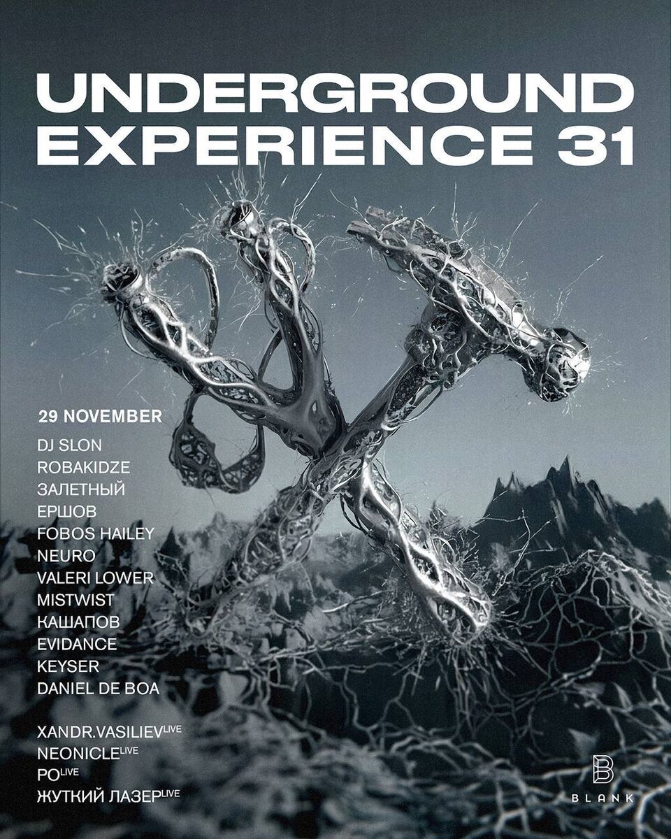 29.11/ UNDERGROUND EXPERIENCE 31/ BLANK 29 ноября в клубе Blank (Санкт-Петербург) пройдет вечеринка в честь 31-летия лейбла Underground Experience. Проект Underground Experience на протяжении 31 года остается одним из символов независимой электронной сцены. За это время на его вечеринках сформировалось целое поколение диджеев, артистов и слушателей. С 1990-х годов лейбл продолжает влиять на культуру, открывать новые имена и задавать новые направления. В программе ночи — выступления резидентов и друзей лейбла на двух танцполах клуба. DJ: SLON ROBAKIDZE ЗАЛЁТНЫЙ ЕРШОВ FOBOS HAILEY NEURO VALERI LOWER MISTWIST КАШАПОВ EVIDANCE KEYSER DANIEL DE BOA LIVE: XANDR.VASILIEV NEONICLE PO ЖУТКИЙ ЛАЗЕР 🎫 Билеты от 700₽ 📆 29 ноября, 23:00 📍Blank, Санкт-Петербург, Арсенальная наб.1