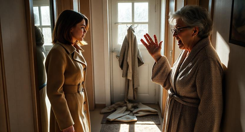 Дарья смотрела на своё пальто, лежащее на грязном полу, и чувствовала, как внутри неё поднимается что-то тёмное и холодное. Людмила Петровна продолжала говорить, но Дарья уже не слышала слов. Она видела только своё пальто в грязи и лицо свекрови, искажённое праведным гневом.