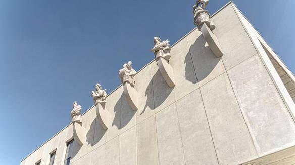 Копии скульптур-аллегорий работы художников Салавата Щербакова и Бориса Орлова – символ пяти морей – сохранили объем и высоту по 3,5 метра, но стали весить в 12 раз меньше и располагаться ниже, чем в оригинальном объеме Когана.