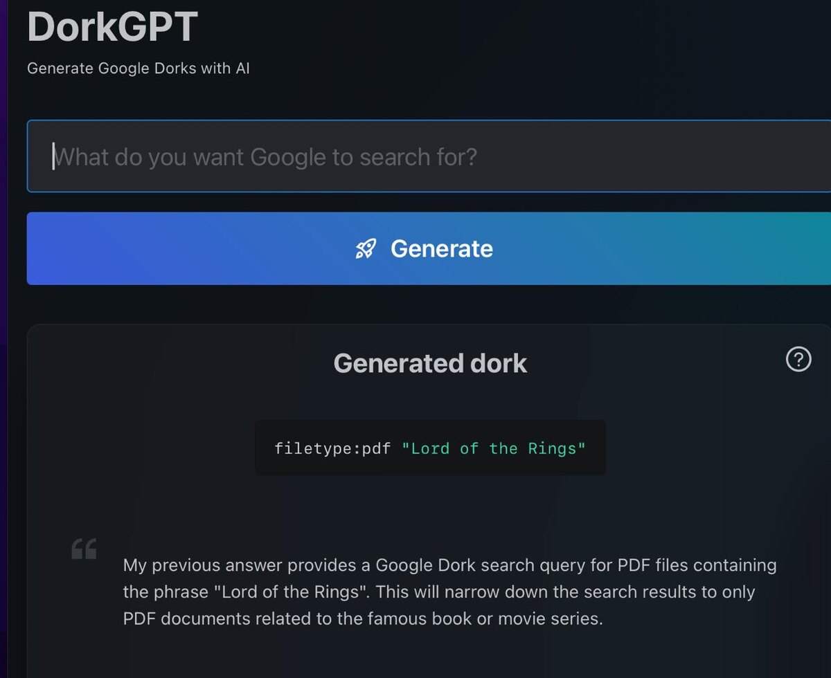 Ловите Google на СТЕРОИДАХ — ИИ предоставит ссылку на сайт, где точно будет файл, документ или ответ, который вы ищете! • Основная фишка DorkGPT — поиск только достоверной и конкретной информации, без SEO-мусора. • Особенно эффективна нейросеть при поиске очень специфических данных. • Поддерживается русский язык и десятки других. • ИИ полностью бесплатен и работает без регистрации. Пользуемся здесь. Бесплатный GPT-bot ⚡️НейроМастер⚡️