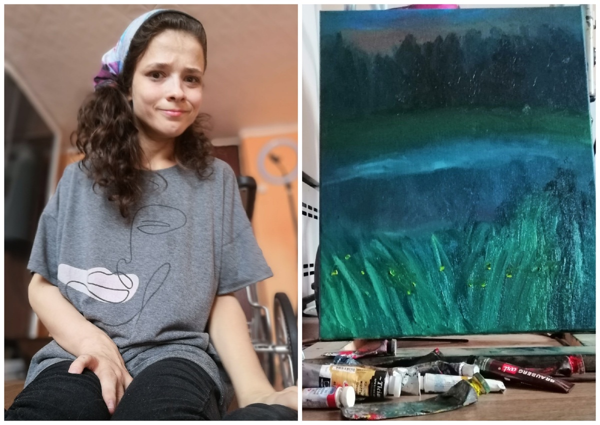 «Кладу холст на пол и рисую». Девушка с ДЦП пишет картины ногами