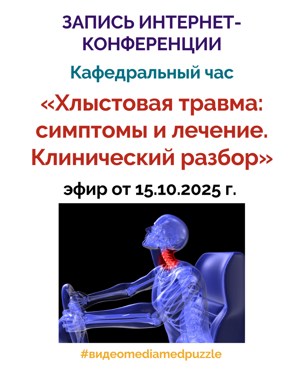 Уважаемые коллеги, приглашаем Вас к просмотру записи интернет-конференции Кафедральный час «Хлыстовая травма: симптомы и лечение. Клинический разбор» ЭФИР от 15.10.2025 г. В рамках интернет конференции прозвучали доклады: «Хлыстовые повреждения шейного отдела позвоночника. Причины. Клиника. Диагностика». Федотова А.В. «Неврологические осложнения после хлыстовой травмы». Соловьева Э.Ю. «Лечение хлыстовой травмы». Федотова А.В. « SYSADOA в лечении осложнений хлыстовой травмы шейного отдела позвоночника». Соловьева Э.Ю.