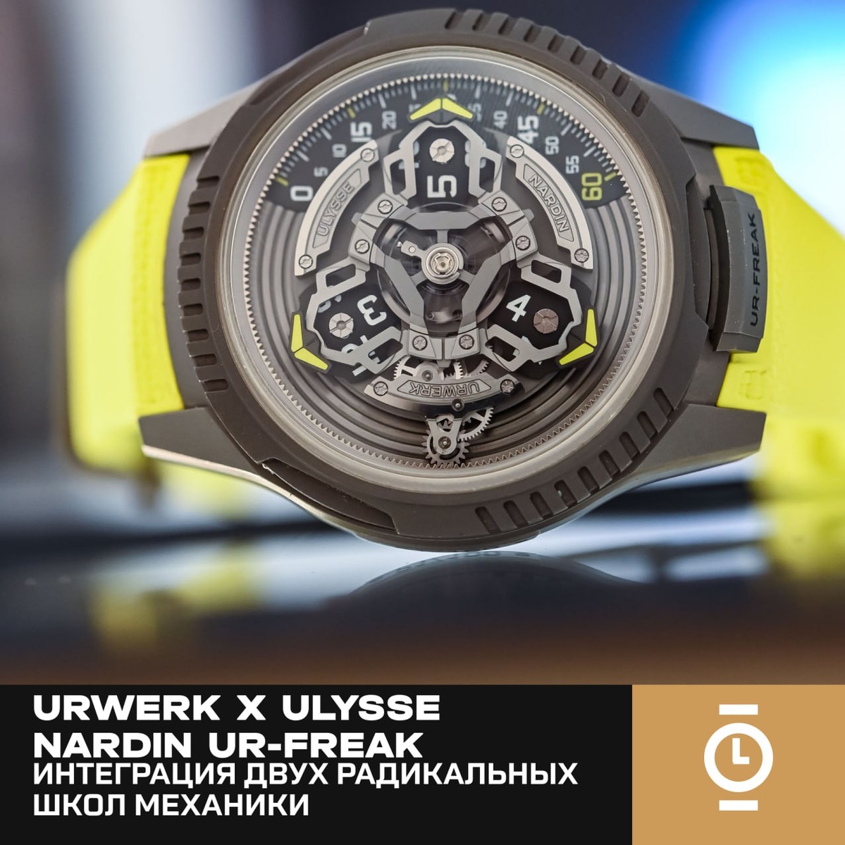 URWERK X ULYSSE NARDIN UR-FREAK: ИНТЕГРАЦИЯ ДВУХ РАДИКАЛЬНЫХ ШКОЛ МЕХАНИКИ #новости_WD URWERK и Ulysse Nardin впервые объединили собственные конструкции в одном калибре, создав UR-FREAK — полноценный гибрид, а не стилизованную коллаборацию. Разработка заняла три года и основана на модифицированном калибре UN-240, в который интегрирована фирменная спутниковая индикация Urwerk. Новый механизм получил индекс UN-241: из исходных деталей сохранено 263 компонента, около 150 созданы заново. Корпус диаметром 44 мм выполнен из отпескоструенного титана и напоминает Freak ONE, но с выраженной архитектурой, характерной для Urwerk. Модель следует традиции Freak: заводная головка отсутствует, время выставляется поворотом безеля с фиксатором на отметке «6 часов», а завод осуществляется через вращающийся задник. При сложной кинематике корпус остаётся водонепроницаемым до 30 м. Под сапфировым стеклом нет циферблата — лишь вращающийся модуль с тремя лучами, несущими куполообразные часовые диски. Акт