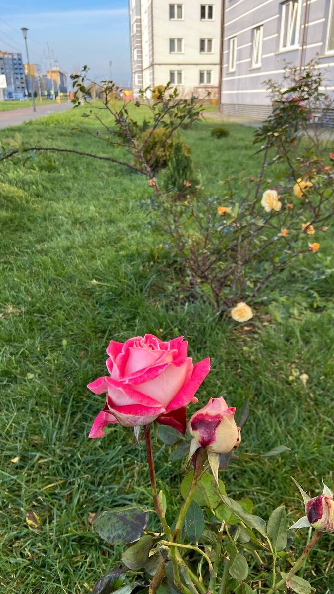 Сегодня четверг, день труда и моей небольшой прогулки. Утром сварила кашу на молоке геркулесовую и щи с мясом. За́нялась приборкой, пообедала и пошла подышать свежим воздухом. Погода была хорошая, иногда даже выглядывало солнышко. Температура была 0°. Розы у дома. Розы в конце ноября в Калиниграде Чудесная розочка в ноябре. Опять розы! Ноябрь 2025 год , в Калининграде. Чайная роза в ноябре. В ноябре цветут розы. Последние розы в этом году. Прошел всего один час и погода испортилась. Стало пасмурно и теплее, температура +2°. Теперь мои фото. Хочу обратить ваше внимание на вот эти голые деревья на нашем бульваре. Пришла осень, ноябрь месяц. А сейчас я на бульваре повернулась на180°. И, посмотрите на красивые акации. Они ещё вчера были пышные и зелёные. Они и сейчас ещё зелёные, но из-за мороза ночью, листочки немножко изменились. Они теперь будут падать, но не желтыми, как на всех деревьях, а зелёными. Позже всех покидают свою листву. Уже идёт сн