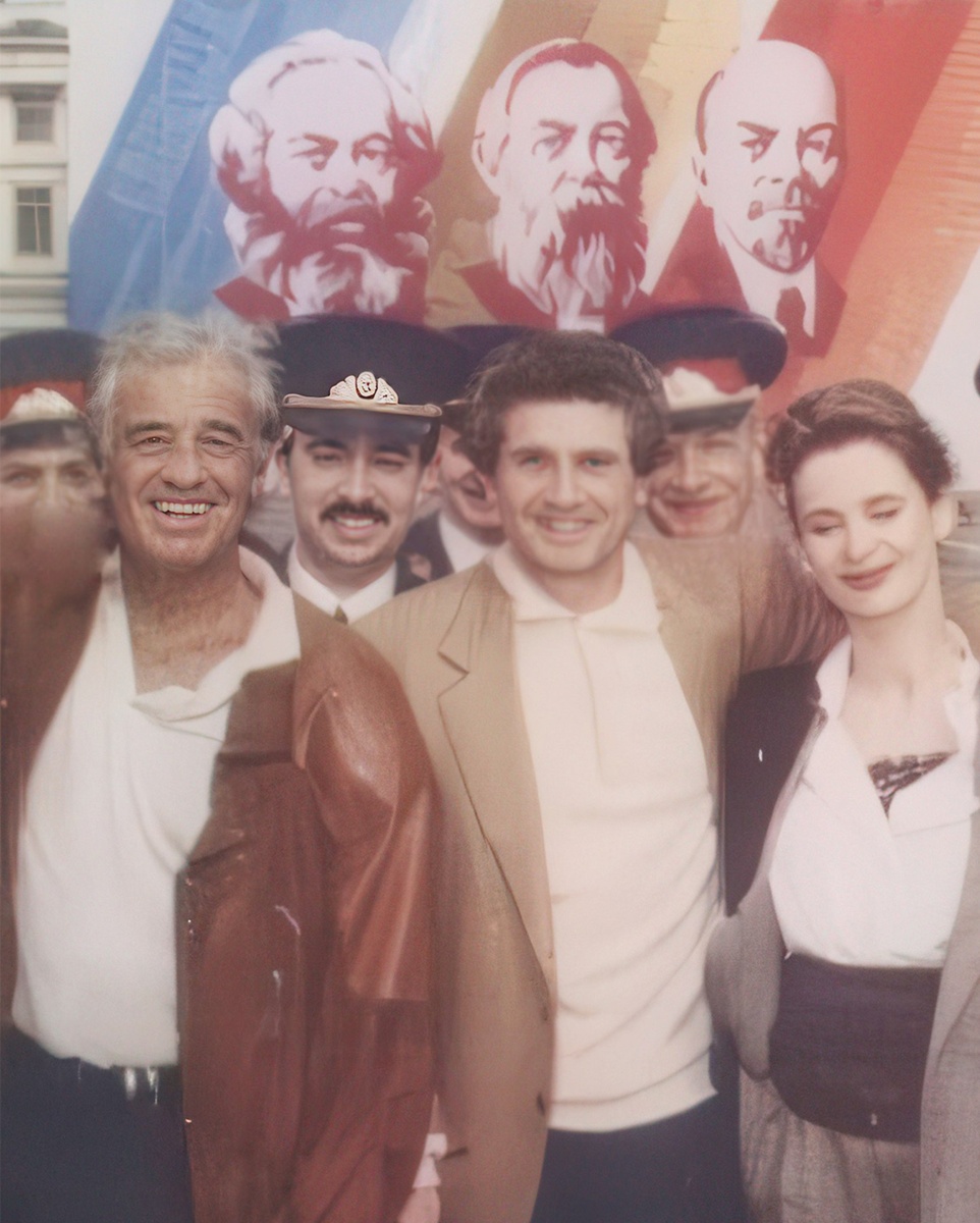 Карл Маркс, Фридрих Энгельс, Владимир Ленин и Жан-Поль Бельмондо. Все четверо в окружении верных поклонников. Снимок был сделан в Ленинграде во время визита знаменитого французского актера в СССР в 1989 году. Мы немного поколдовали с фото в нейросетях, чтобы восстановить.