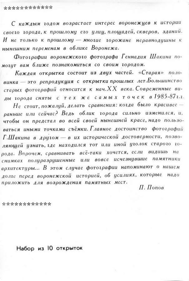 В 1985-1987 годах Геннадий Шакин сделал фотографии различных уголков Воронежа. Потом совместили на одной открытке вид дореволюционного города и современный, в результате были выпущены 4 набора замечательных открыток. В каждый выпуск состоит из 10 открыток и двух разворотов обложки. Давайте посмотрим третий и четвертый выпуски открыток. К сожалению, в моей коллекции нет оригинальных наборов, и отсканировать в достойном качестве возможности у меня тоже нет. Изображения взяты с сайта Воронежского исторического форума. В подписях к фотографиям, для удобства восприятия и ориентации в пространстве, я буду приводить современные топонимы. А здесь можно посмотреть открытки из первых двух наборов. Вступительное слово краеведа Павла Попова: 1. Улица Плехановская и площадь Ленина. 2. Никитинская площадь. 3. Вид на водохранилище. 4. Улица Плехановская. 5. Воронежский государственный университет инженерных технологий (Технологический институт). 6. Перекресток улиц Фридриха Энгельса и Чайковского. 7.