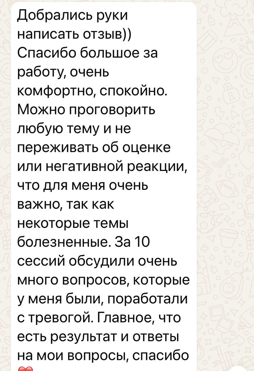 Клиент – девушка 28 лет. ДО с чем пришла 1.Я привыкла к какой -то агрессии людей и воспринимаю всех не безопасно 2. Тревожусь от того, что не умею определять, когда человек переходит границы 3. Часто в иллюзии, что человек хороший, а потом все наоборот 4. Отец алкоголик и мы жили с ним до моих 6 лет. 5. Мать давала поддержку не мне, а своим мужчинам 6. До 25 лет я выбирала партнеров таких как мой отец Для меня, как специалиста – у клиента фоновая тревога из-за базового недоверия к миру, страх агрессии. Это не дает ей свободу и пространство для построения новых качественных отношений. Прошли 20 сессий. Рилив – все непростые ситуации по техникам Перемоделирование и Отреагирование, Замешательство прошли; отца по технике Глубокая проработка отношений проработали; технику Личные границы тоже взяли; в трансперсональном подходе все почистили. ДПДГ – страх агрессии мужчин отцепили, обиды на мать отцепили Результаты ПОСЛЕ со слов клиента 1. Пропала постоянная тревога 2. Спустя 2 месяца после р