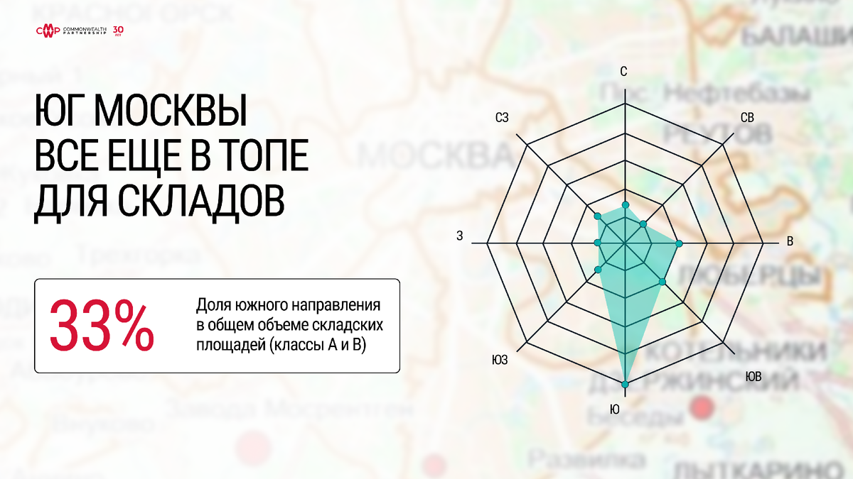 По данным Commonwealth Partnership (CMWP) по состоянию на ноябрь 2025 г. доля южного направления в общем объеме складских площадей (классы А и В) составляет 33%. Юг Москвы традиционно является самым насыщенным складскими объектами направлением. Юг Москвы обладает схожими тенденциями развития с общим складским рынком Московского региона — увеличение объемов нового строительства и доли BTS объектов, а также рост вакансии. Доля южного направления в общем объеме складских площадей (классы А и В) — 33%. По итогам первых десяти месяцев 2025 г, в южном направлении Московского региона: Это в 2 раза выше по сравнению с аналогичным периодом 2024 г. и составляет 45% от общего объема ввода в эксплуатацию. Показатель по южному направлению вырос в два раза по сравнению с аналогичным периодом прошлого года. Интересно, что 31% от общего объема нового строительства в южном направлении составили мультитемпературные склады, что связано с вводом в эксплуатацию здания ВкусВилл в NK Парк Домодедово 2 (89 ты