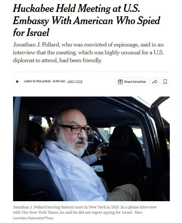 CIA and White House ‘CONCERNED’ by US Ambassador Huckabee’s ‘private, unannounced meeting’ with spy Jonathan Pollard The former US Navy intel analyst served 30 years in prison (1985-2015) on charges of spying for Israel
