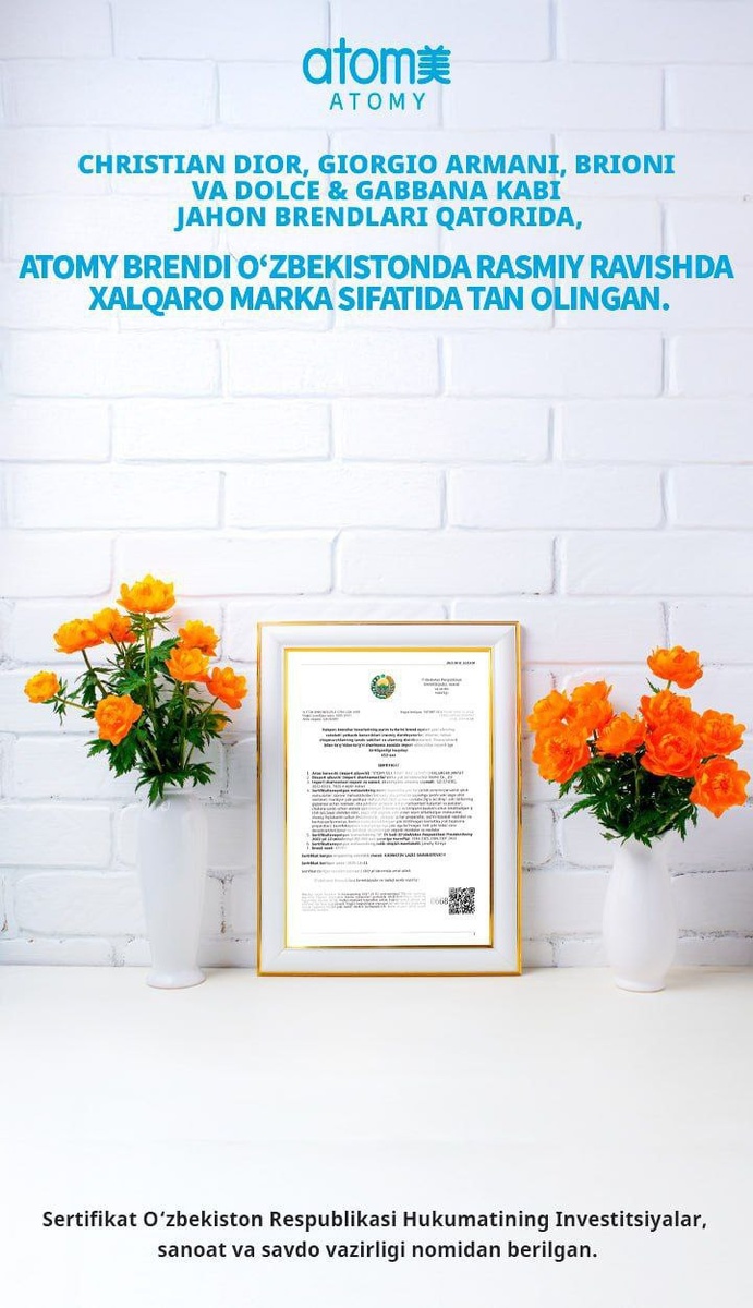 🔥 УЗБЕКИСТАН ПОСТАВИЛ АТОМИ В ОДИН РЯД С DIOR! ️ Просто вдумайтесь: правительство Узбекистана включило Atomy в официальный список люксовых брендов вместе с: ✔️Christian Dior ✔️Giorgio Armani ✔️ Dolce&Gabbana Это не маркетинг — это государственный сертификат от Министерства инвестиций и торговли! 🏛️ Atomy прошел жесточайшую проверку: ✅Качество продукции мирового уровня ✅Международный статус ✅Соответствие стандартам люкса Ваши клиенты до сих пор сомневаются в статусе Atomy? Покажите им этот документ! Как думаете, почему правительство выбрало именно Atomy? Пишите в комментариях— самые яркие ответы ждут сюрпризы! 🎁 #AtomyЛюкс #СертификатКачества #МЛМПремиум #Узбекистан #БрендУровняDior P.S. Теперь ваши знакомые не смогут сказать, что МЛМ — это "несерьезно". Atomy изменил правила игры! 💫 Как вам такие новости, а вы ещё думаете?