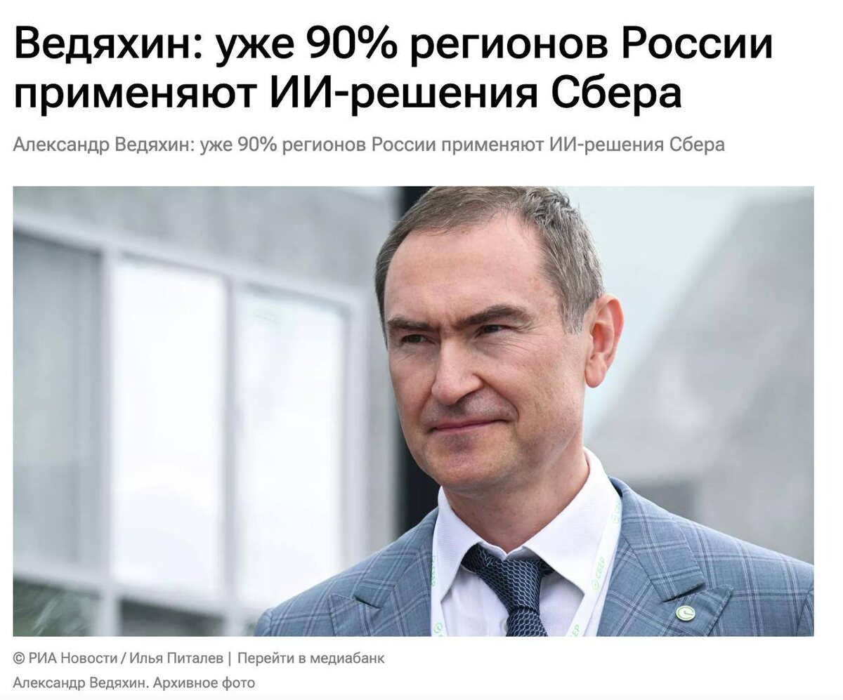 90% регионов России применяют ИИ-решения Сбера Александр Ведяхин, первый зампред правления Сбера, сообщил, что 90% регионов используют ИИ-технологии банка, что улучшает взаимодействие граждан с госструктурами, делая его быстрее, удобнее и персонализированнее. Сбер активно развивает ИИ в медицине, образовании, сельском хозяйстве и госуслугах. ────────── ⚡️Важные новости – без лишнего шума!⚡️ Подпишись на канал и получай только суть: оперативно, чётко, по делу! 👉 ИнфоСплетник | @infospletnik