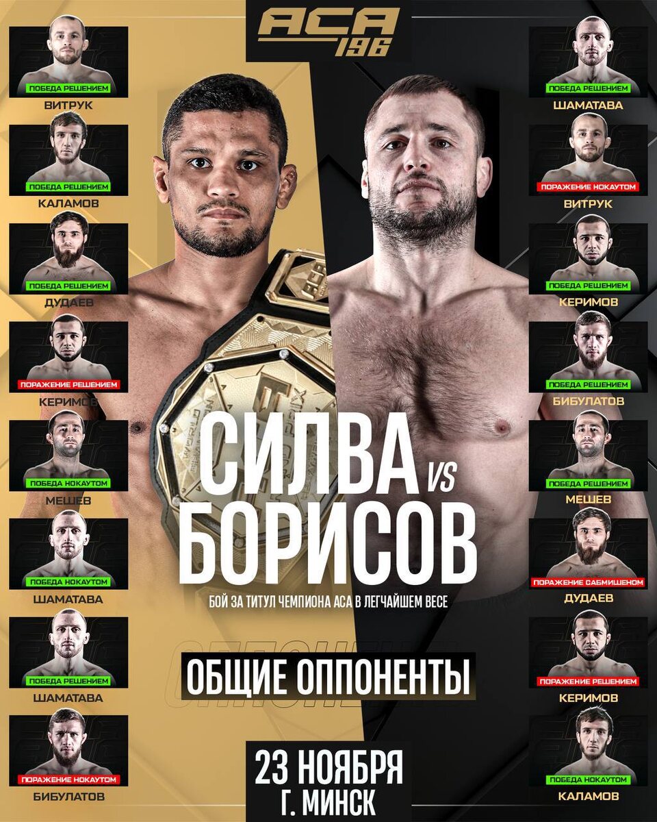 Их объединяет не только сражение за чемпионский пояс на турнире АСА 196 в Минске, но и оппозиция настоящих монстров легчайшего дивизиона. Рекорд претендента Олега Борисова в данных поединках — 5-3, а рекорд чемпиона Джосиела Силвы — 6-2 Как вы считаете, кто лучше показал себя против общих соперников — 🇷🇺Борисов или Силва🇧🇷❓
