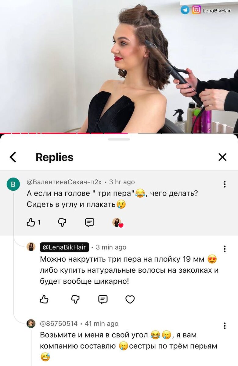 😎 Помните, если вы делаете укладку с вычесом, то лучше взять диаметр поменьше, тк при вычесе локон раскроется в волну. Например под последним уроком на YouTube девушки нашли друг друга с «тремя перьями» 🤭 Я бы взяла на такие волосы 19 или 22 мм, и скорее всего делала бы классической техникой волны. А вы что делаете, когда видите три пера? #инсайт@lenabikhair