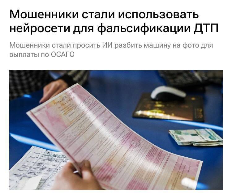 Мошенники используют ИИ для фальсификации ДТП чтобы получить страховые выплаты В интернете распространяются объявления о создании с помощью искусственного интеллекта поддельных фотографий ДТП за несколько сотен рублей, которые успешно проходят по полисам ОСАГО и КАСКО — отличить их от настоящих практически невозможно. К сгенерированным снимкам прилагаются составленные нейросетью обращения в страховые компании, из-за чего страховщикам приходится тратить значительное время на проверку подлинности таких заявлений и доказательство их фальсификации. 👉🏻Новости №1 в Ростове 💌Прислать новость/фото Ростов Папа теперь в Ⓜ️🅰️❌